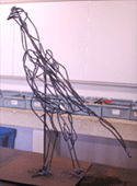 計画があるわけではない。この線がどうしても必要だと思ったところに、直感的につけていく。空間にデッサンしている感じである。横から見ても、前から見てもそこに必然的にある線でなければならない。集中し、ここしかないという気持ちになるまで鉄と格闘する。その空間と気持ちが繋がった感じがしたら溶接する。せっかく位置が決まっても、溶接する瞬間に動いたり、熱で鉄が曲がったりして思い通りにはいかないものである。 説明しつくしてない(完成していない)形は、私にとって魅力的だ。主要な心棒だけの方が、軍鶏の感じが良く出ているように思う。でもやれるだけやって、そこから引き算したものには(最初と同じになったとしても)何か残存するものがある。 人生も同じで、幼児期の人間は神様のようである。しかし数々の苦難を乗り越えた老人の笑顔にも神性が宿っている。 |