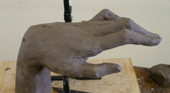 「手」の制作にとりかかる。木と針金で心棒を作り、荒付けした。昨晩悩みに悩んで、水簸(すいひ)粘土ではなく「油土」を使っている。石膏雌型を壊して改めてシリコン雌型を作るか(水簸粘土成形)、シリコン+石膏型にしてウレタン鋳造までやってしまうか(油土成形)ずいぶん迷った。今回は復元に近い作業だと割り切り、油土でかっちり作ることにした。 実際作ってみてダビンチのデッサンはやはり一流だと思う。上手に嘘をついている。(←よりそれらしくみせている)写真よりダビンチのデッサンを見た方が作りやすい。彼が内的に形をつかみ取っているので、成形が楽なのだ。イヤイヤはじめた仕事ではあったが、非常に学ぶところがある。おもしろい。彫刻的には前にのびる動線を出したいと思っている。 2週間前に、うちの子どもが急に「鍬で畑を作る!」と言いだした。そこで宿舎の共有スペースを家族で耕し、畝を作っている。将来絶対必要になる、と彼女は確信している。環境問題など不安な世情にあって、次世代はしっかり未来を見据えているようだ。ダビンチの素描の立体化も「未来に差し伸べる手」というひとつの作品に仕上げたいものだ。
