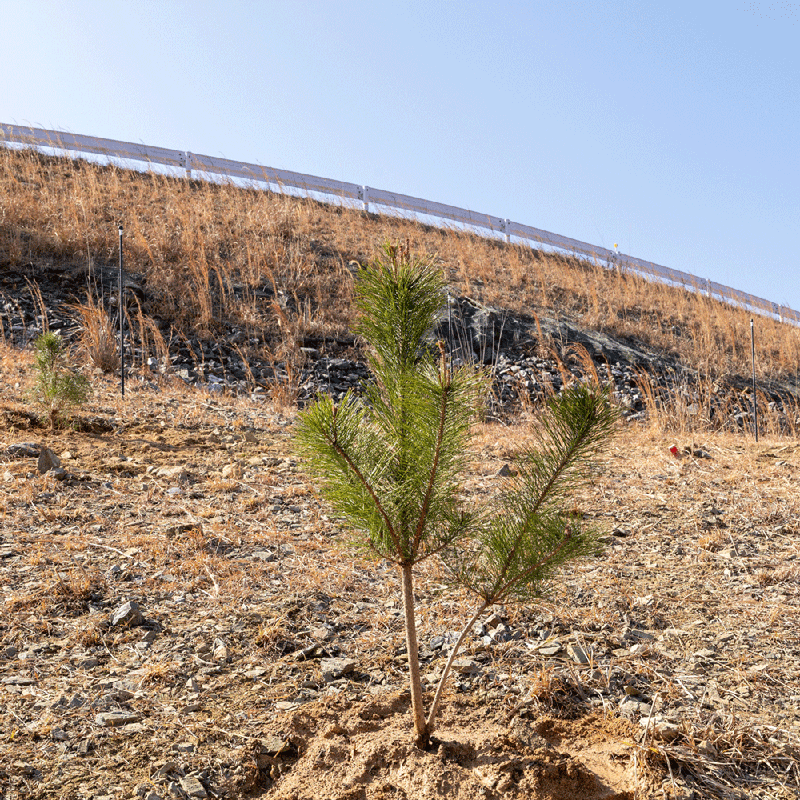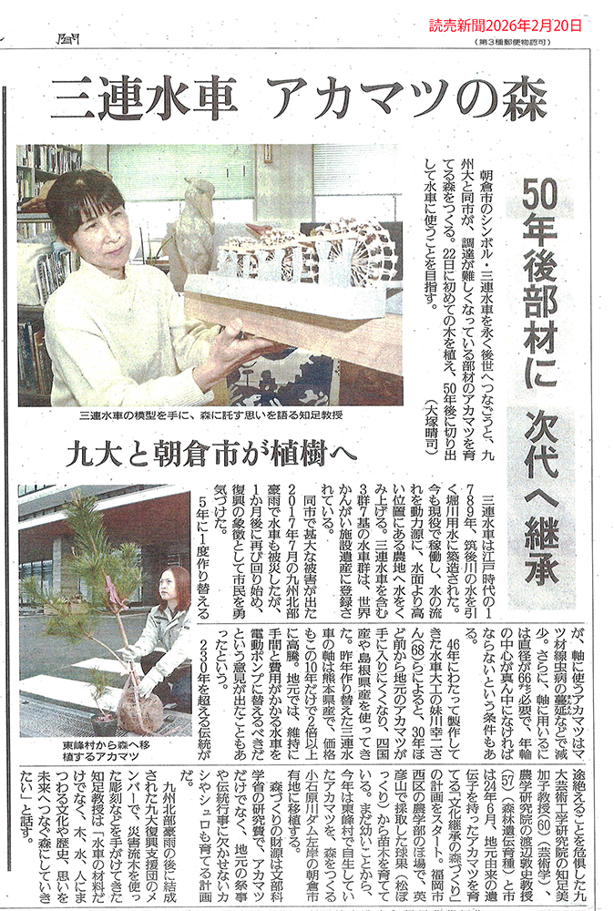 私は2024年度に北海道のチコロナイ活動(アイヌ文化継承の森づくり)等のフィールドワークを通して、森林を観察し体験すること、および木を使うことで「森をデザイン」することが重要性に気づきました。また自然に関わる伝統文化や信仰における継続性や感情の共有が、コミュニティの再生に繋がることがわかりました。このような経緯をふまえ、朝倉市、水資源機構および九州大学農学部教授・渡辺敦史の協力のもと、コア山跡地の稗田地区に試験的に「文化継承の森づくり」を継続しています。植栽予定の樹木は、アカマツは「三連水車群」、カシは「黒川高木神社の沓形餅づくりの杵」、シュロは「美奈宜神社の獅子舞の蓑」の素材となる予定です。これらは、遺伝子撹乱がおこらないよう地域(英彦山分水嶺)の在来種としています。荒地に強いアカマツを最初に植えることは、森林遷移を鑑みても理にかなっています。2年かけて、英彦山修験道由来の歴史ある在来種実生苗、球果、挿木枝を採取し、九大圃場にて植栽準備を進めています。2026年2月22日に、朝倉市主催の植樹会が開催されました。育成中の苗は幼かったため、小石原川ダムの東峰村側に天道生え(九州の方言で自然発生した植物)したアカマツを移植する形で植樹会を行いました。今後、九大農学部、芸術工学部の学生たちも参加し、当該地の科学的調査および景観デザインを進めます。将来的には市民、特に子ども達が遊びに来て、50年後の未来を思い描く場になってほしいと願います。(*読売新聞にて紹介されました→記事リンク)→活動説明ポスター