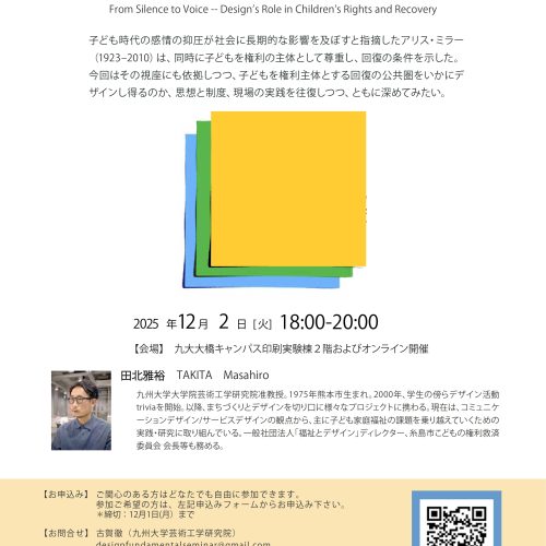 第34回デザイン基礎学セミナー『沈黙から言葉へ:子どもの権利と回復を支えるデザインの役割』九州大学大学院芸術工学研究院デザイン基礎学研究センターでは、第34回デザイン基礎学セミナー『沈黙から言葉へ:子どもの権利と回復を支えるデザインの役割』を以下のとおり開催します。どなたでもご参加できますので、ぜひお申込くだ…