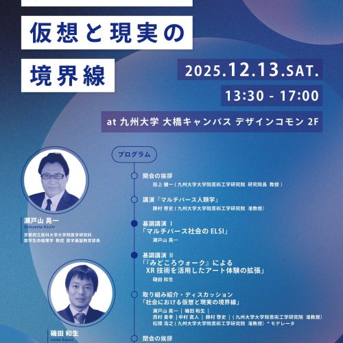 MulSHIPシンポジウム「社会における仮想と現実の境界線」を開催しました2025年12月13日(土)、九州大学大橋キャンパスにて、マルチバース社会デザイン研究拠点プロジェクト(MulSHIP)主催のシンポジウム「社会における仮想と現実の境界線」を開催しました。 MulSHIPは、芸術工学研究…