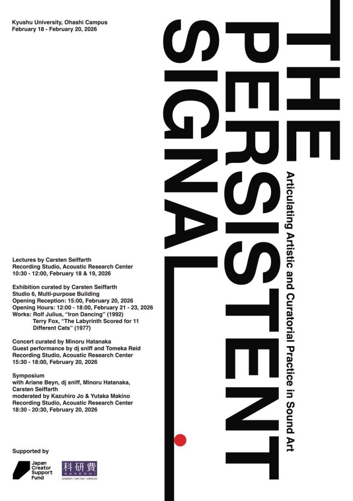 3日間にわたり、レクチャー、展覧会、コンサート、そして最終日のシンポジウムを通して、サウンド・アートにおける芸術実践およびキュラトリアル実践の批評的かつ実験的アプローチを提示します。歴史的視座を現代における実践の課題や今後の展望と接続しながら、音楽、パフォーマンス、美術、メディアアート、科学技術、さらには政治的言説にまで広がる多様な実践の射程からサウンド・アートを考察します。開催概要
