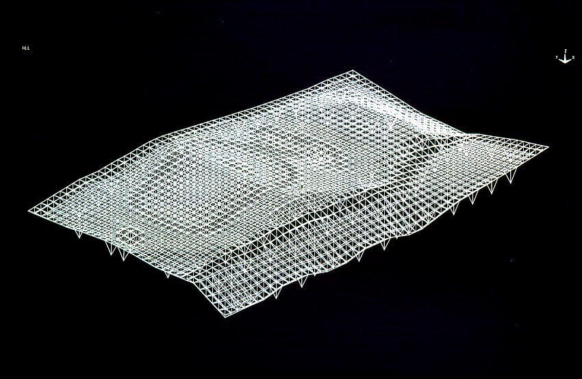 Yoh: I did. For the Galaxy Toyama Gymnasium, I designed a cantilevered 3D truss roof. In Toyama the snow can pile up to three meters, so a flat roof is going to undergo severe deformation. I got the lab to calculate numerical values for this deformation using a computer simulation, and determined the positions of pillars based on this data. Professor Matsui also conducted a photoelastic test. The results of the computer analysis of deformation were almost the same as the striped stress pattern that appears in the photoelastic test, and we were able to verify that the two were in agreement. Seen from the inside, this 3D truss resembles a galaxy. The periphery has a uniform height, but in the interior, the nodes are at varying heights.