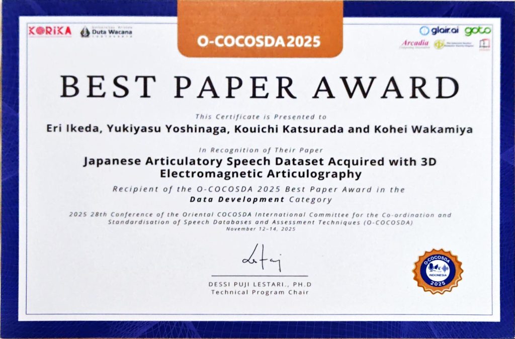 「Oriental COCOSDA 2025」において、Best Paper Awardを受賞