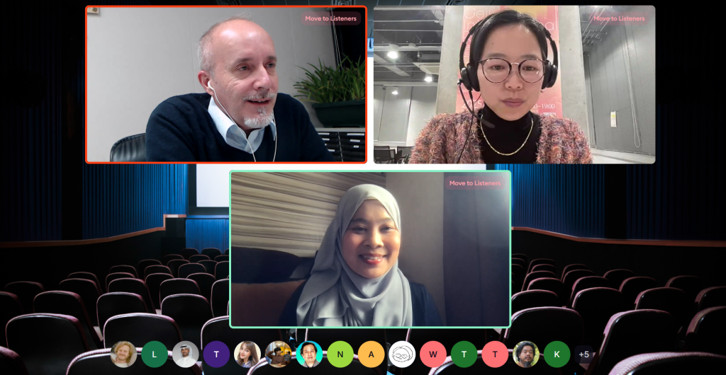 日本時間17時から19時まで、オンラインプラットフォームSpatialChatを用いて実施し、同窓生、在学生、そして本学の教職員が参加しました。プログラムは、芸工インターナショナルオフィス室長のGerard B. Remijn教授による開会あいさつで始まり、副室長のYaya Yao助教から芸工の近況報告が行われました。
