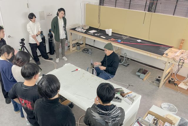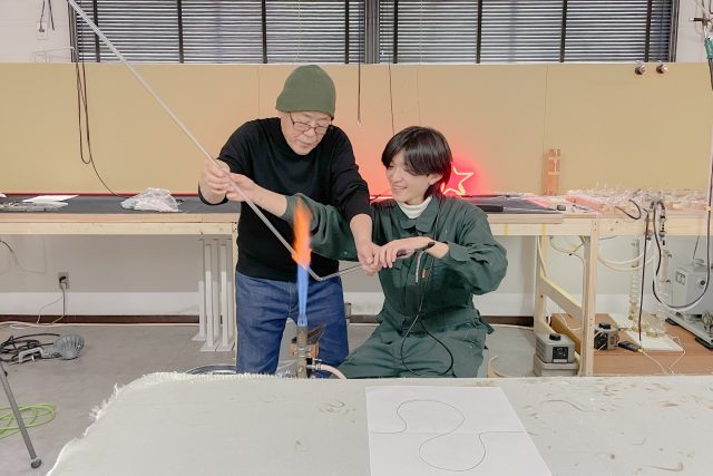芸術工学部未来構想デザインコースでは、2025年12月19日、レクチャーおよびワークショップ「光をつくる/光で考える —— ネオン管加工の技術と美学」を実施しました。ネオン管加工の専門家である(有)関東ネオン代表の坂口照好氏・坂口恵子氏を講師に迎え、ネオン管加工の実演と設計体験を通して、光をつくる技術と、それを用いる思考の両面に触れました。