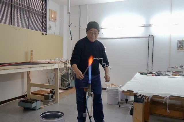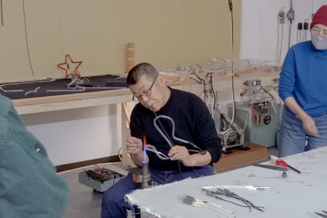 その後、曲げ加工を終えたガラス管に坂口さんが電極を取り付け、内部を真空引きしたうえでネオンガスを封入するなどの工程を経て、ネオン管が完成しました。