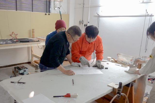 まず、作りたい形を検討するところから始めました。ガラス管加工の特性上、加工が簡単な形、難しい形があるため、坂口さんにアドバイスをいただきながら、各自で形を決めていきました。