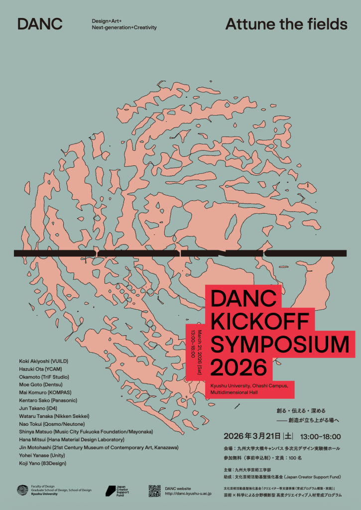 DANC(ダンク)は、芸術工学研究院が中心となり、芸術と科学を横断する創造的な活動を支えるプロジェクトです。映像、音楽、プロダクト、建築などさまざまなデザイン分野を行き来しながら、新たな表現やデザインの可能性を探り、その実践を国内外の文脈へとつなげていきます。