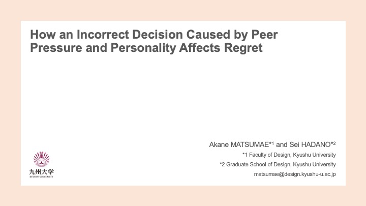 2021年9月23-25日に開催されたInternational Human Systems Engineering and Design Conference(クロアチア/オンライン)にて,昨年度松前研を卒業した羽田野さんの卒論を発展させた研究発表”How an Incorrect Decision Caused Peer Pressure and Personality Affects Regret(同調圧力による誤判断と個人特性が後悔に与える影響)”を報告しました.